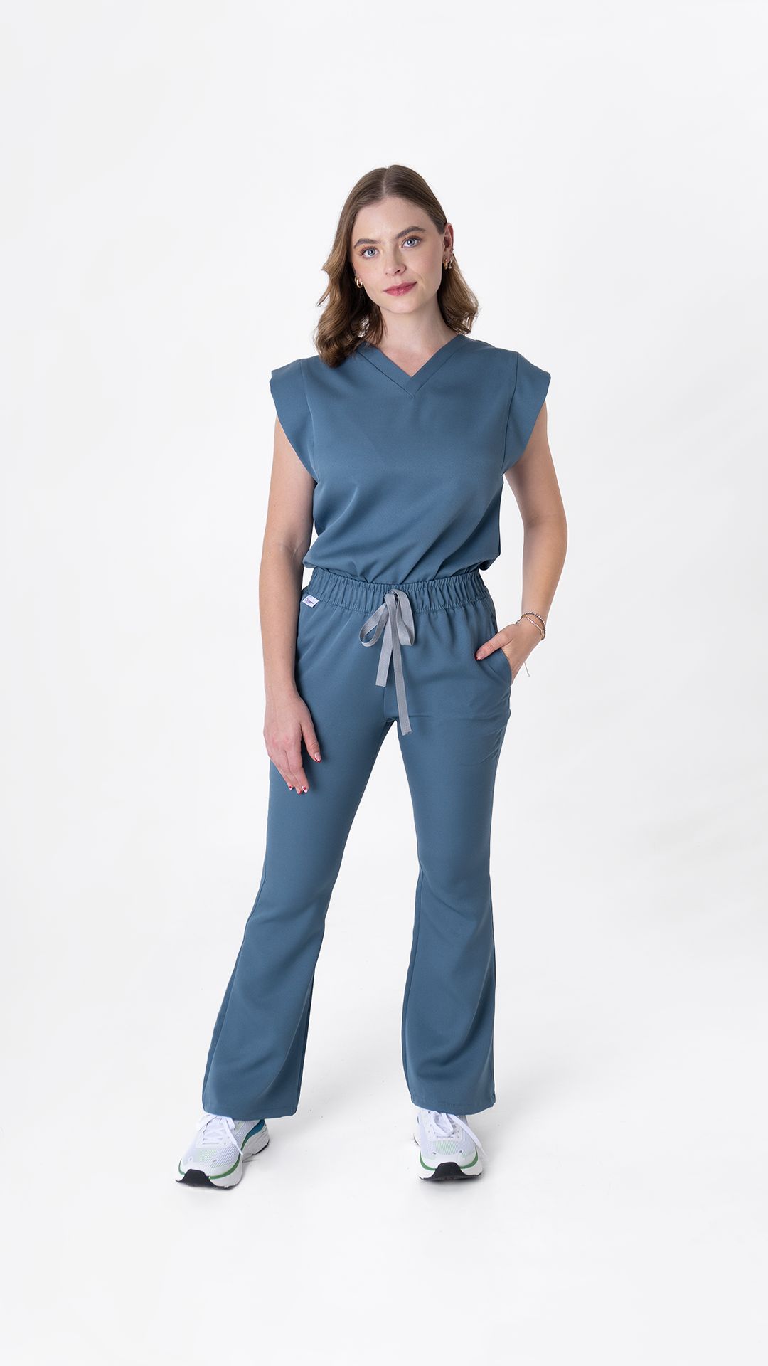 Pantalón: Corte campana con resorte en cintura y 2 bolsas.