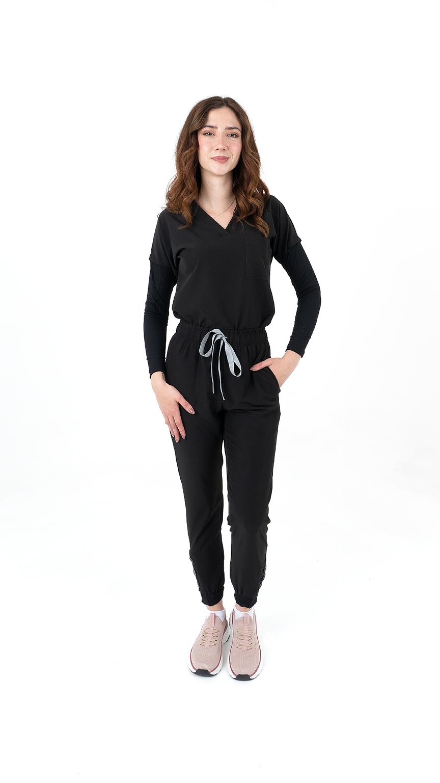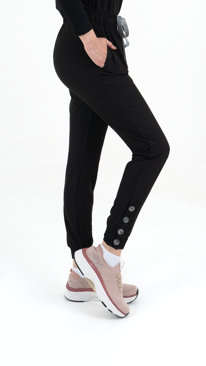 Pantalón: Tipo jogger con bolsas laterales y botones en tobillo.
