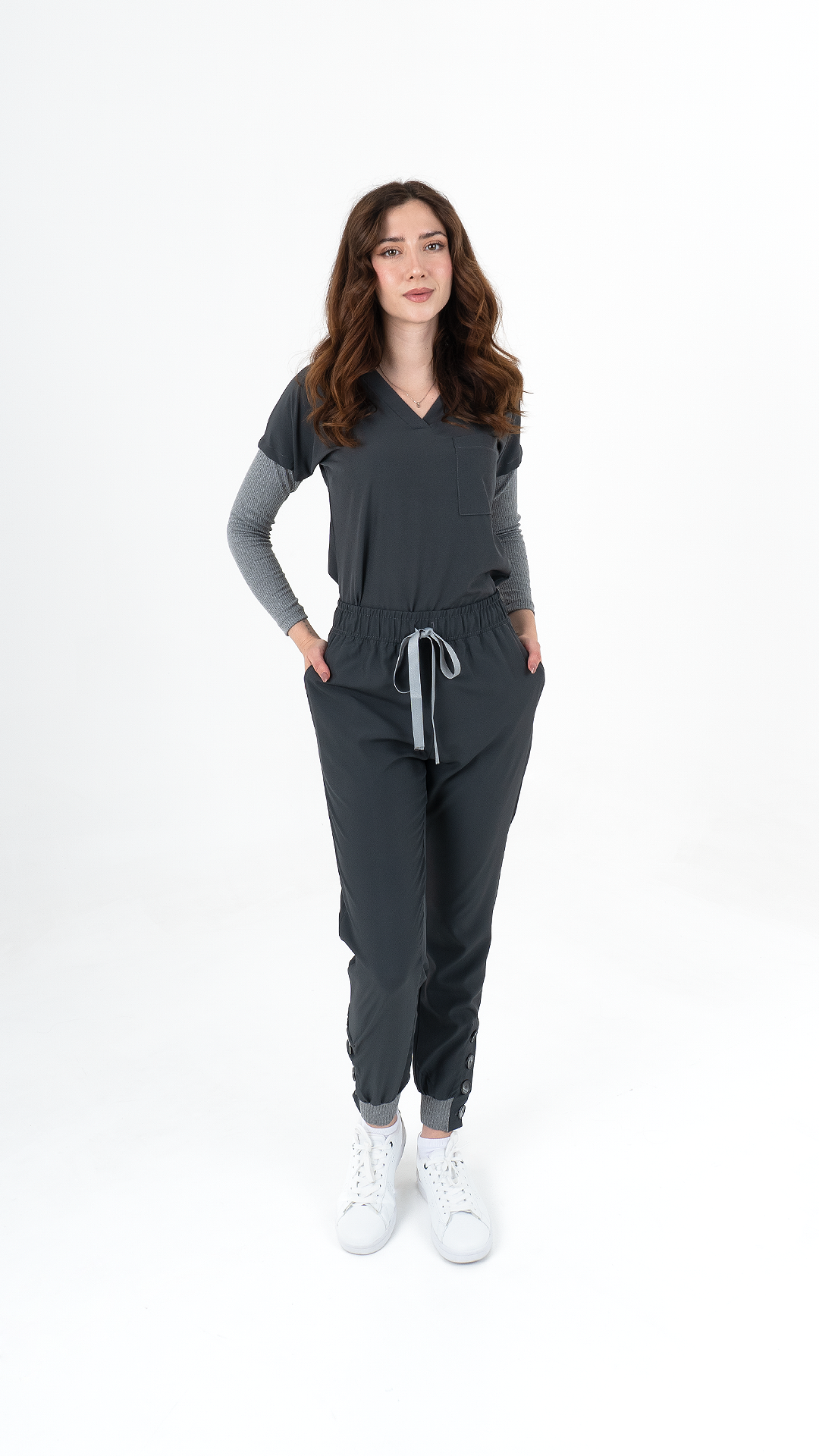 Pantalón: Tipo jogger con bolsas laterales y botones en tobillo.