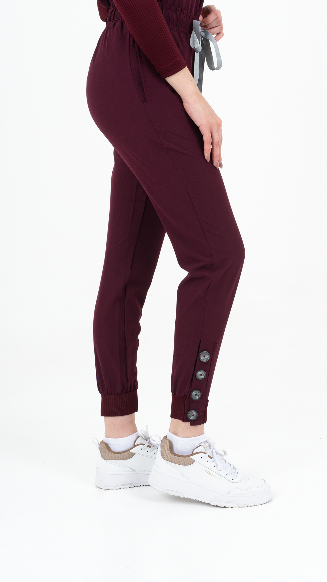 Pantalón: Tipo jogger con bolsas laterales y botones en tobillo.